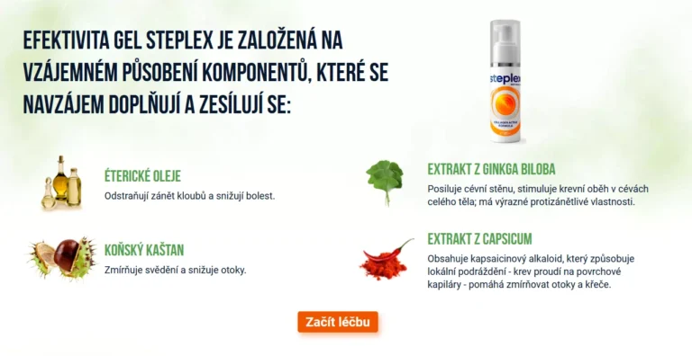 Zde je seznam složek gelu Steplex™ a účinky každé složky: